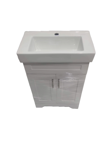 24″X18″ WHITE PORCELAIN CERAMIC VANITY WITH CABINET BEAUTIFULL DOORS HANDLE. VERY EASY TO INSTALL. EASY TO CLEAN CERAMIC SURFACE. VERY SMOOTH DOOR CLOSE.
